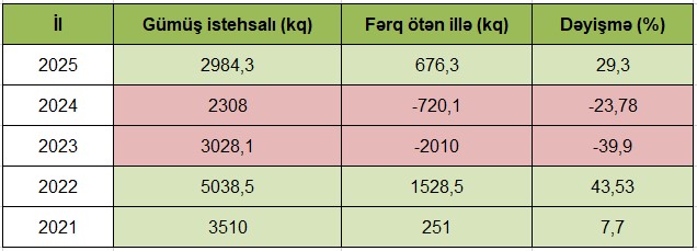 2020-ci ilin yanvar-sentyabr aylarında isə gümüş istehsalı 3259 kiloqram təşkil edib. 2021-ci ilin müvafiq dövründə bu rəqəm 251 kiloqram və ya 7,70% artıb.