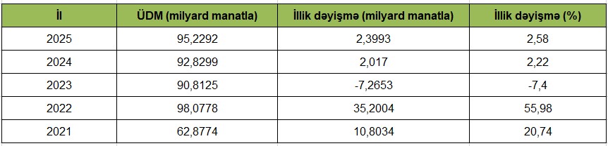 Azərbaycan hər il milyardlarla manatlıq Ümumi Daxili Məhsul istehsal edir. Son beş ilin göstəriciləri iqtisadiyyatın illər üzrə qazandırdığı dəyəri və dəyişmə tempini ortaya qoyur.