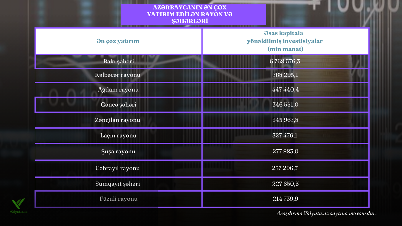 Azərbaycanın ən çox yatırım edilən - RAYON VƏ ŞƏHƏRLƏRİ