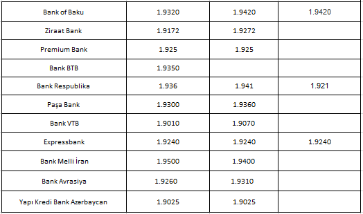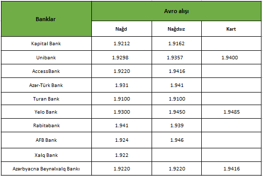 Ümumilikdə, banklarda avronun nağd alış qiyməti 1.9010-1.9500 manat, nağdsız alış qiyməti isə 1.9070-1.9460 manat aralığında dəyişir. Kart üzrə alış məzənnəsi açıqlanan banklarda bu göstərici 1.9210-1.9485 manat intervalındadır.