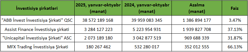 Bu ilin yanvar-sentyabr aylarında dövriyyəsi ən çox azalan investisiya şirkətləri aşağıdakı kimi olub: