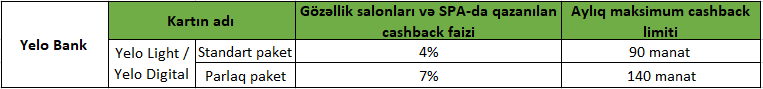 "Yelo Bank"ın təklif etdiyi paket çərçivəsində həm əsas, həm də əlavə kateqoriyalardan ikisini seçmək imkanı verilir. Beləliklə, ay ərzində ümumilikdə dörd kateqoriyadan yararlanmaq mümkündür.
