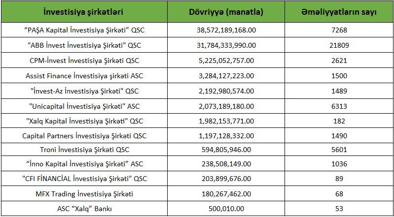 Siyahının ikinci pilləsində 31,8 milyard manat dövriyyə ilə “ABB İnvest İnvestisiya Şirkəti”, üçüncü yerdə isə 5,2 milyard manat dövriyyə ilə “CPM-İnvest İnvestisiya Şirkəti” qərarlaşıb.