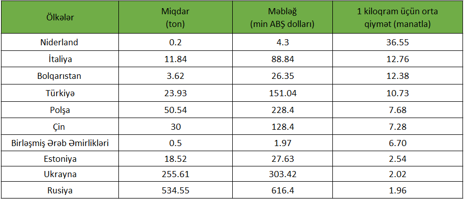Ən bahalı nərə balığı Niderlanddan alınıb. Belə ki, bu ölkədən alınan nərə balığının bir kiloqramının orta qiyməti 36 manat 55 qəpik olub.
