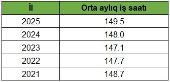 Valyuta.az xəbər verir ki, 2025-ci ilin yanvar-iyul aylarında bu göstərici 149,5 saat təşkil edib. Müqayisə üçün, 2024-cü ildə bu rəqəm 148 saat, 2023-cü ildə 147,1 saat, 2022-ci ildə 147,7 saat, 2021-ci ildə isə 148,7 saat olub.