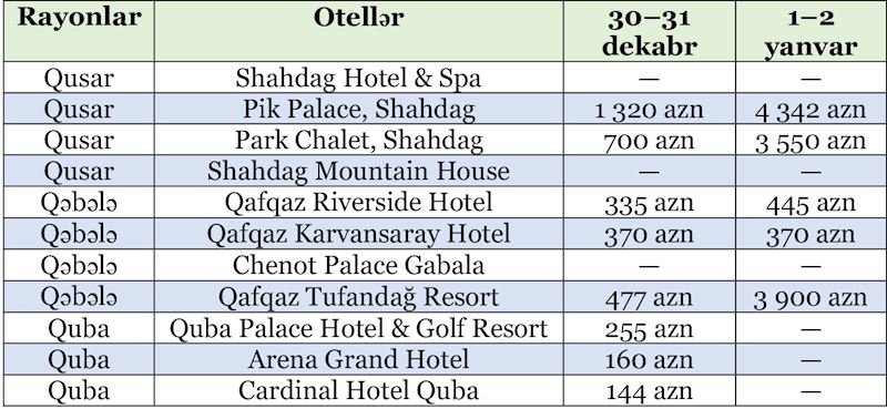 Qeyd edək ki, qış istirahəti üçün əlverişli olan rayonlarda – Qusar, Qəbələ və Qubada yerləşən bəzi otellərdə bu günə (24 dekabr) olan məlumata görə 2 nəfərlik otaqların qiymətləri (1 gecə, 2 gün) aşağıdakı kimidir: