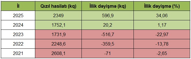2021-ci ildə hasilat 2608,1 kiloqram səviyyəsində olub. Müqayisədə 359,5 kiloqram və ya 13,78 faiz azalma qeydə alınıb.