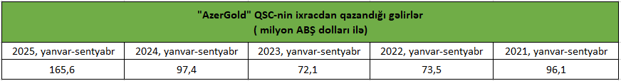 Bu ilin yanvar-sentyabr aylarında "AzerGold" QSC-nin xaricə satışdan əldə etdiyi gəlirlər 165,6 milyon ABŞ dolları təşkil edib.