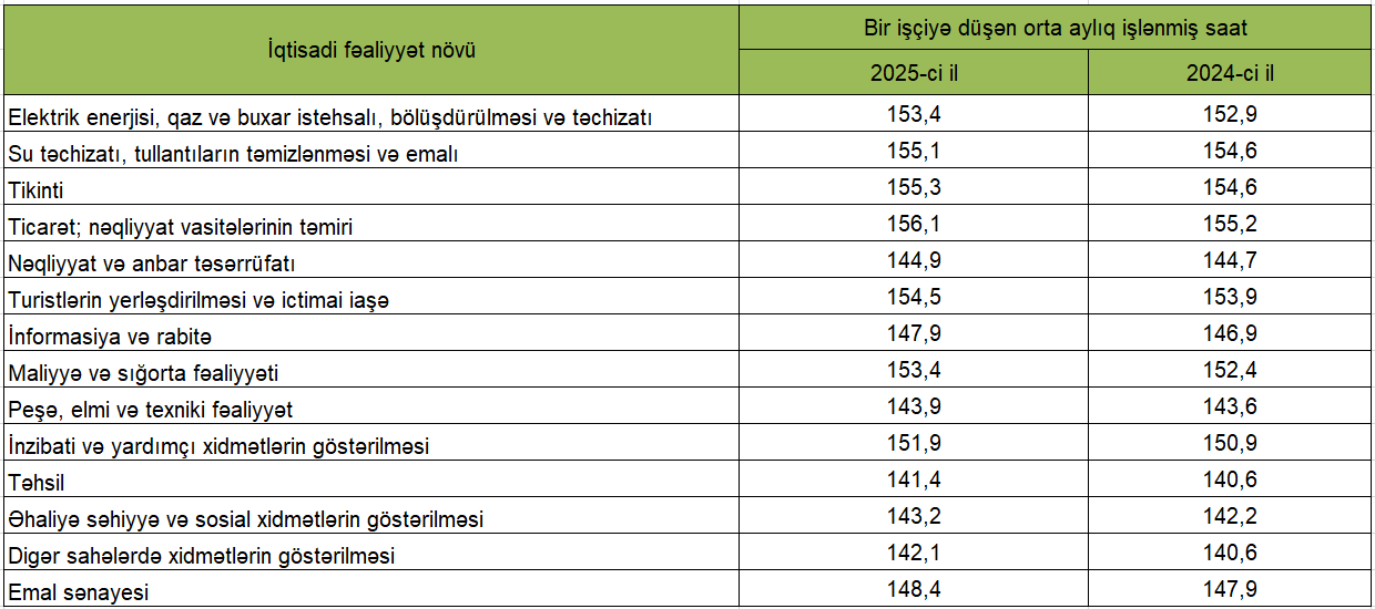 2025-ci ilin ilkin məlumatlarına əsasən, bir işçiyə düşən orta aylıq işlənmiş iş saatlarının miqdarı 149,5 saat təşkil edib.