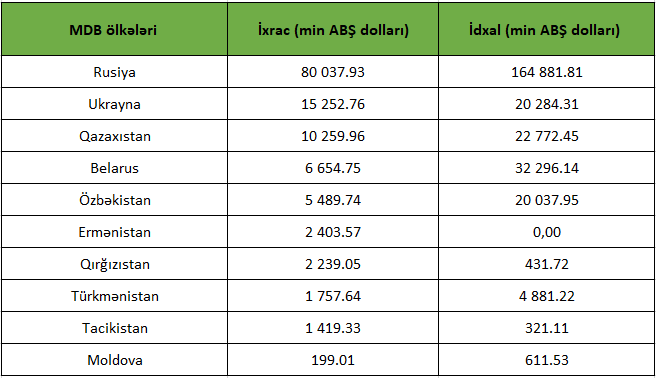 Azərbaycanın MDB ölkələri ilə ticarətdə əsas tərəfdaşları - ÖLKƏLƏR