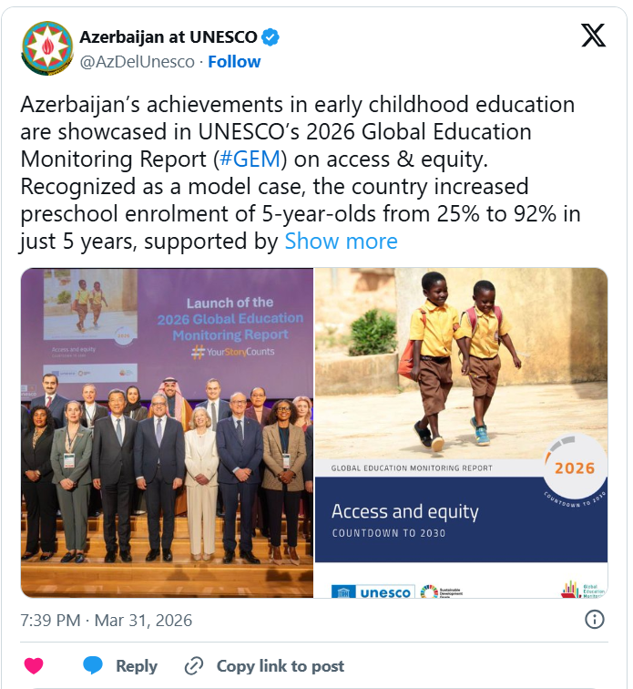 Azərbaycanın erkən uşaqlıq dövrü təhsili sahəsindəki nailiyyətləri UNESCO-nun əlçatanlıq və bərabərliyə dair 2026-cı il Qlobal Təhsilin Monitorinqi Hesabatında (GEM) nümayiş etdirilib.