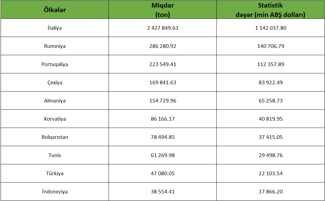 Valyuta.az açıqlanan rəsmi statistikalara istinadən xəbər verir ki, bu ay ən çox neft ixrac olunan ölkələr arasında İtaliya 2 427 849.63 ton neftlə birinci sırada yer alır. II və III sırada 286 280.92 və 223 549.41 ton neftlə Rumıniya və Portuqaliya qərarlaşıb.