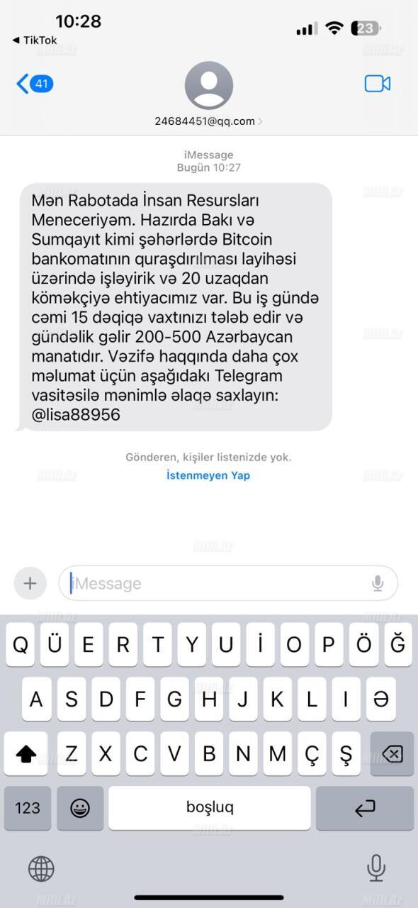 Mesajlarda özünü insan resursları meneceri kimi təqdim edən şəxslər Bakıda və Sumqayıtda guya bitcoin bankomatlarının quraşdırılması layihəsi üzrə uzaqdan iş təklif etdiklərini iddia edirlər.