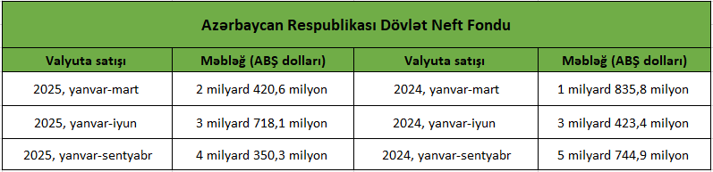 2025-ci ildə Azərbaycan Respublikası Dövlət Neft Fondu tərəfindən həyata keçirilən valyuta satışının aylıq göstəriciləri ilə aşağıdakı cədvəldən tanış ola bilərsiniz:
