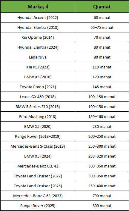 Valyuta.az aşağıdakı cədvəldə ən çox seçilən modellərin 1 günlük icarə qiymətlərini təqdim edir.