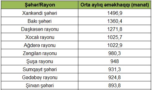 Ən çox orta aylıq əməkhaqqı verən şəhər və rayonlar aşağıdakılardır.