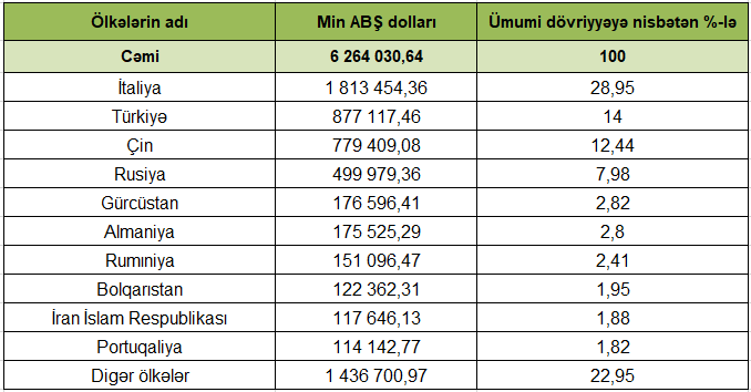Ticarət dövriyyəsində ölkələr üzrə bölgüyə gəldikdə isə, ilk yerdə 1 milyard 813 milyon 454,36 min ABŞ dolları ilə İtaliya qərarlaşıb.