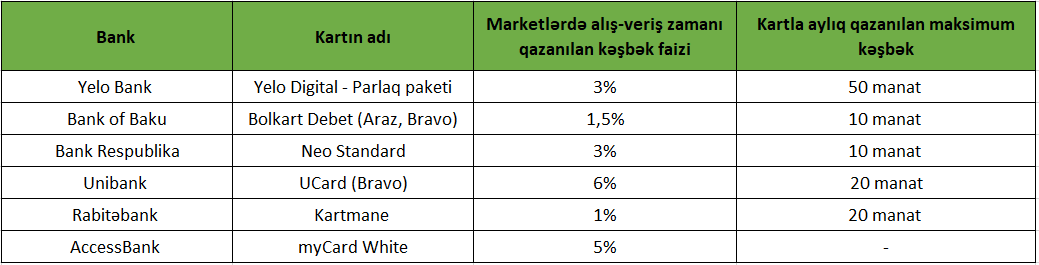 Bu baxımdan müxtəlif bankların kartları market alışları zamanı təqdim etdikləri keşbek faizi və aylıq maksimum məbləğə görə fərqlənir.