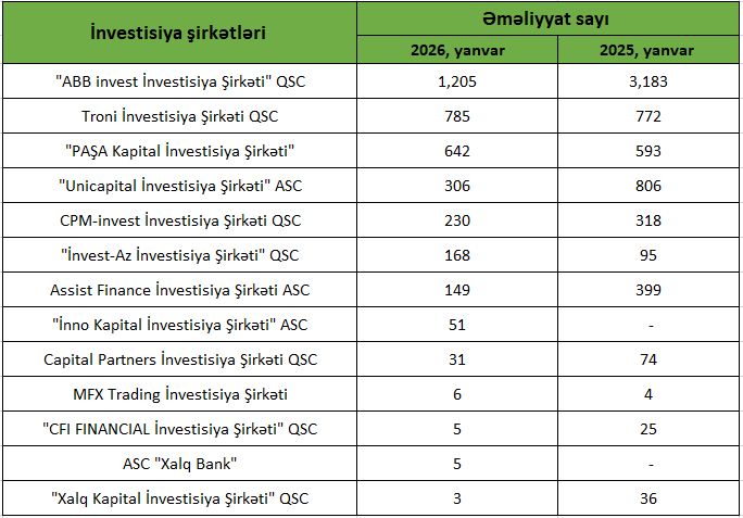 Valyuta.az xəbər verir ki,, 2026-cı ilin yanvar ayında investisiya şirkətləri arasında əməliyyat aktivliyi üzrə fərqli dinamika müşahidə olunub. Bəzi bazar iştirakçıları illik müqayisədə artım nümayiş etdirsə də, bir sıra şirkətlərdə azalma qeydə alınıb.