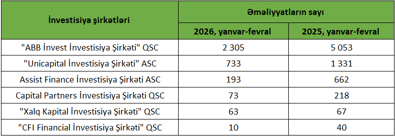 2026-cı ilin yanvar-fevral aylarında Azərbaycanda fəaliyyət göstərən bir sıra investisiya şirkətlərinin əməliyyat sayında ötən ilin eyni dövrü ilə müqayisədə azalma qeydə alınıb.