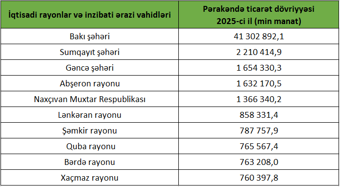 2025-ci il ərzində iqtisadi rayonlar və inzibati ərazi vahidləri üzrə pərakəndə ticarət dövriyyəsi Azərbaycan Respublikası üzrə 67 637 864,5 min manat olub.