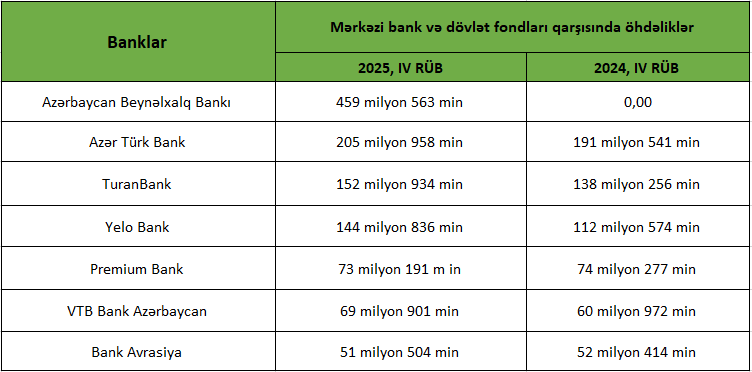 2025-ci ilin yanvar-dekabr aylarında bankların Mərkəzi Bank və dövlət fondları qarşısında öhdəlikləri üzrə lider Azərbaycan Beynəlxalq Bankı olub.