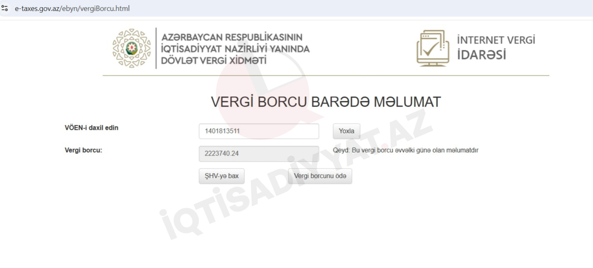 Məlumata görə, "İmprotex İndustries” şirkətinin İqtisadiyyat Nazirliyi yanında Dövlət Vergi Xidmətinin Bakı şəhəri Lokal Gəlirlər Baş İdarəsinə 2 223 740.24 manat vergi borcunun olduğu üzə çıxıb.