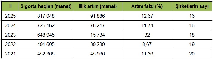 Ümumilikdə son 5 ildə (2021-2025) sığorta şirkətlərinin topladığı sığorta haqları 364 milyon 682 min manat və ya 80,6% artaraq 452 milyon 366 min manatdan 817 milyon 048 min manata yüksəlib.