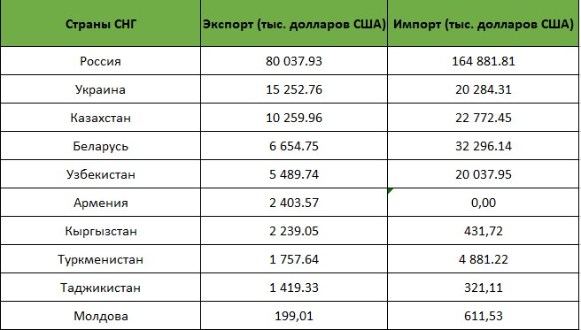 Что касается импорта, то в январе–июне текущего года объём импорта из стран СНГ составил 266 млн 518 тыс. долларов США, что равно 20,47% от общего импорта. За аналогичный период прошлого года этот показатель составлял 436 млн 219 тыс. долларов США (21,25% от общего импорта).