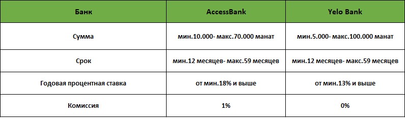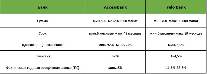 Valyuta.az в этой статье сравнил кредитные продукты AccessBank и Yelo Bank, предлагаемые в виде наличного кредита и кредита с обеспечением залогом.