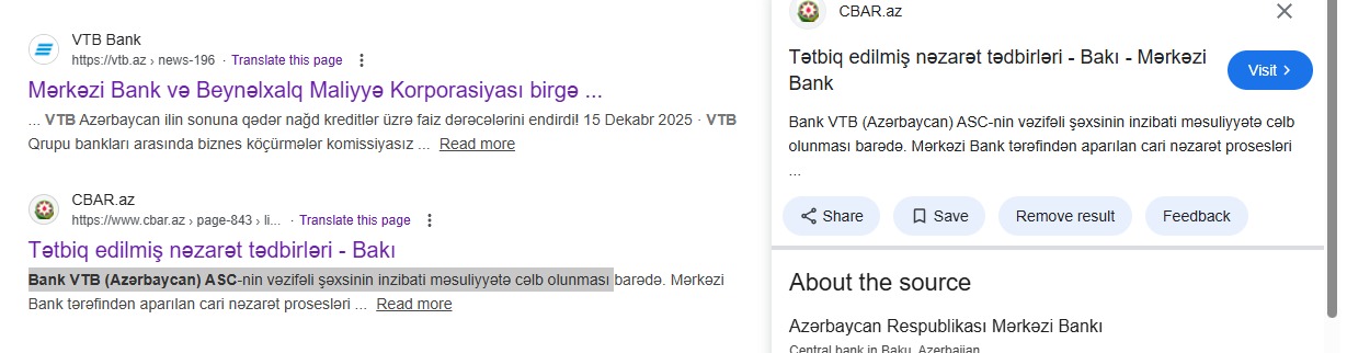 По данным проведённого расследования, некоторое время назад — 14 августа 2025 года — Центральный банк Азербайджана распространил официальную информацию о привлечении одного из должностных лиц ОАО «Банк ВТБ Азербайджан» к административной ответственности за нарушение законодательства. Данное сообщение в течение определённого времени размещалось на официальном сайте Центробанка, однако впоследствии по неизвестным причинам было удалено.