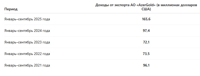 За январь–сентябрь текущего года доходы ОАО «AzerGold» от внешних продаж составили 165,6 миллиона долларов США.