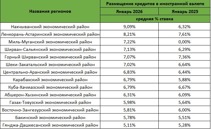 В то же время в ряде регионов отмечено снижение. В Горном Ширване ставка снизилась с 7,36% до 7,07%, в Восточном Зангезуре — с 6,00% до 5,81%, а в Гянджа-Дашкесанском экономическом районе — с 5,28% до 5,11%.