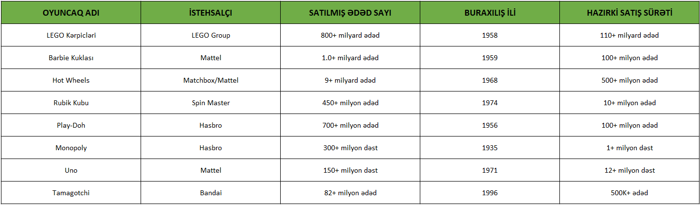 Ən çox satılan oyuncaq modellərinin təhlili göstərir ki, uzunmüddətli uğurun açarı aşağıdakı faktorlarda gizlidir: